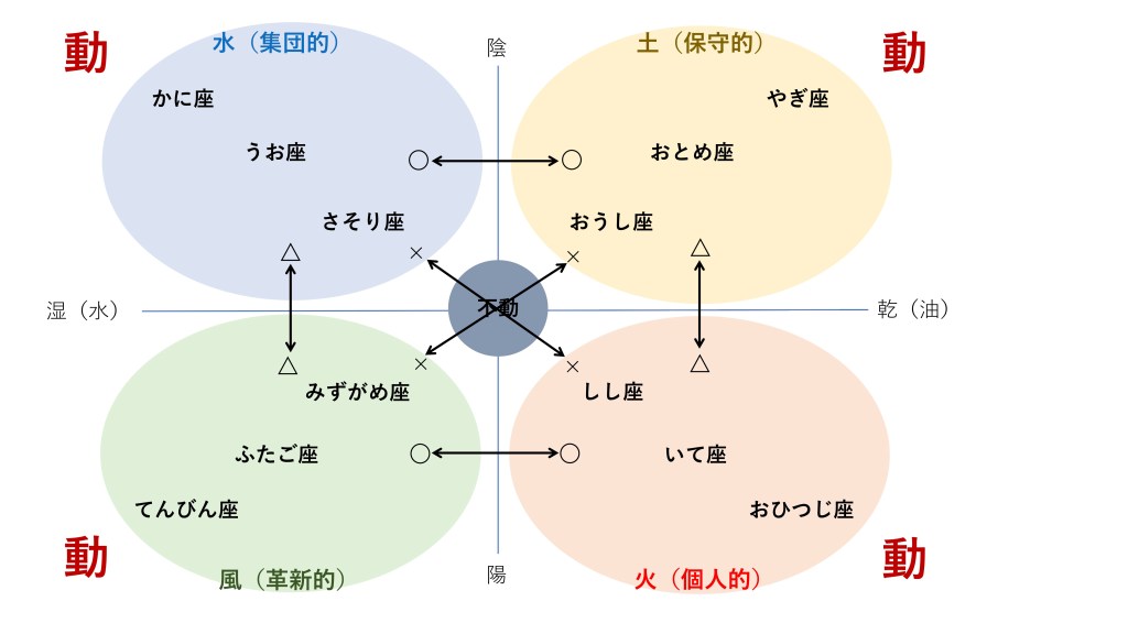 この12星座の表に陰陽五行の木(風)・火・土・金・水を重ね合わせたのが下の図です。
