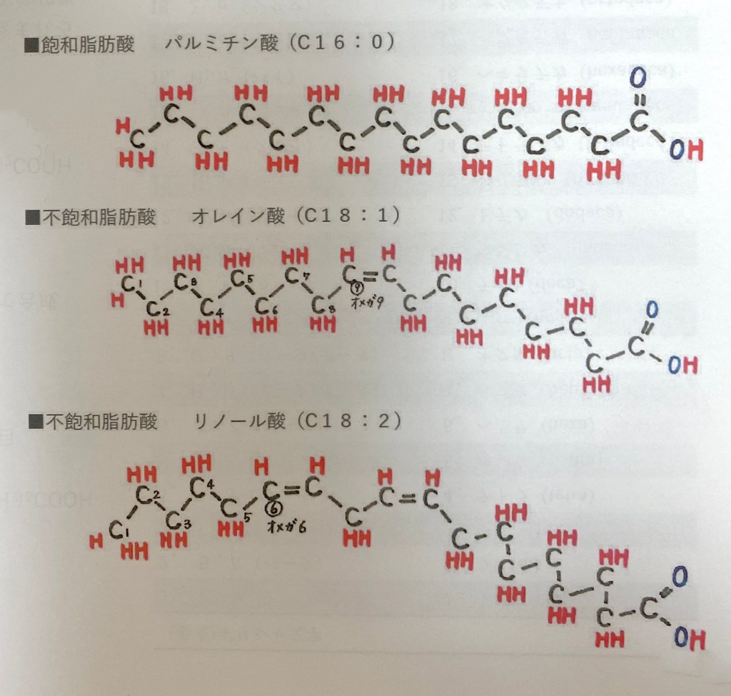 一番上の化学構造式が飽和脂肪酸です。炭素(C)が全て水素(H)と結合している状態の脂肪酸。図はパルミチン酸(炭素が16個)ですが、パーム油はラウリン酸(炭素が12個)なので、もう少し炭素鎖が短い(分解されやすい)脂肪酸になります。