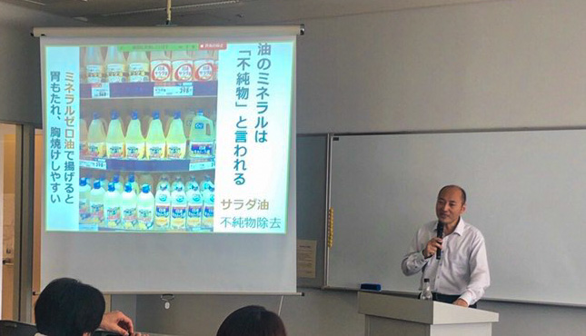 「油っこくない」「油っぽくない」油に向かって「もっと油っこくていいんだよ!」「油っぽくないあなたは誰?」と語る中戸川先生のお話に会場は笑いに包まれます。
