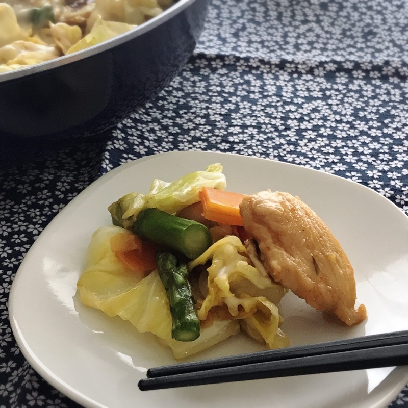 大人気のチーズタッカルビにカレー味をプラス!カレーとヤンニョムとチーズの相性が抜群です 春キャベツ、アスパラガ …