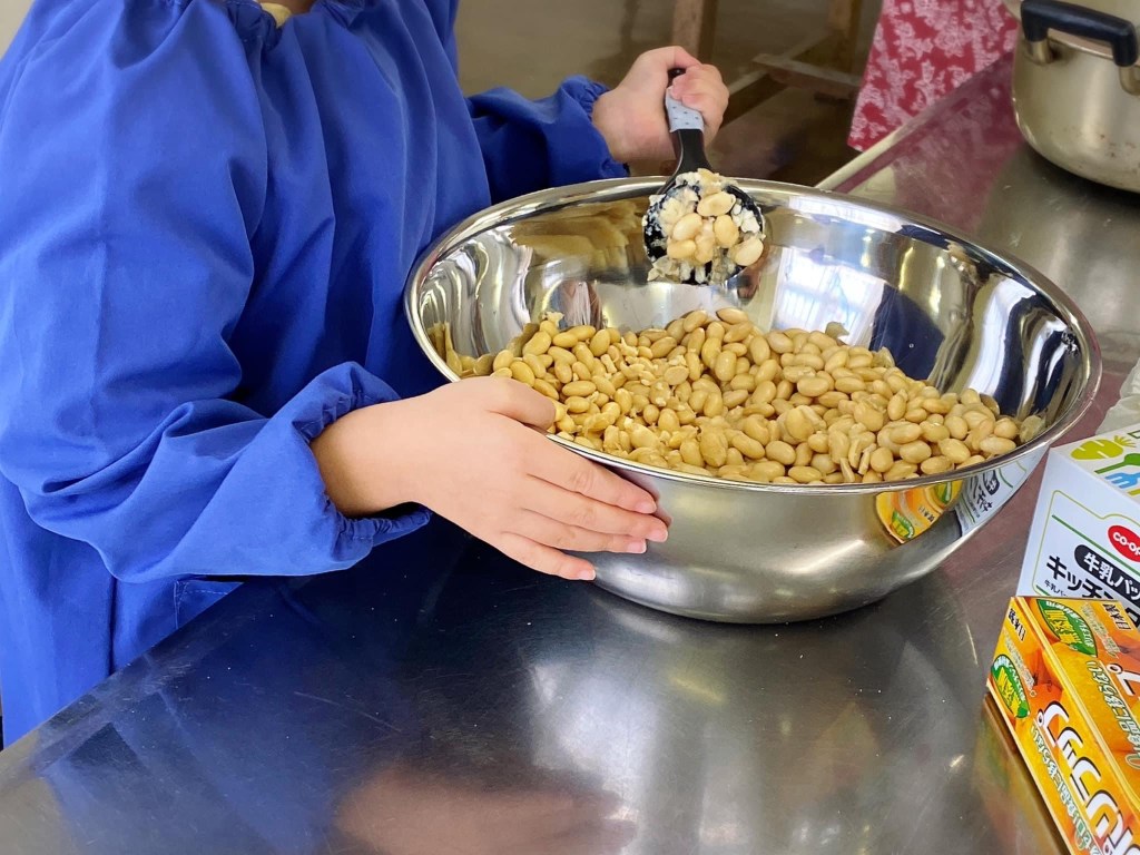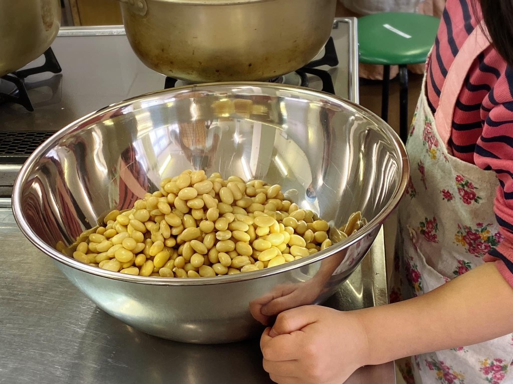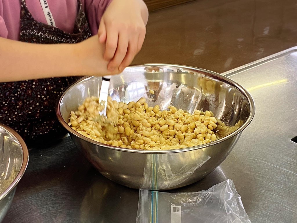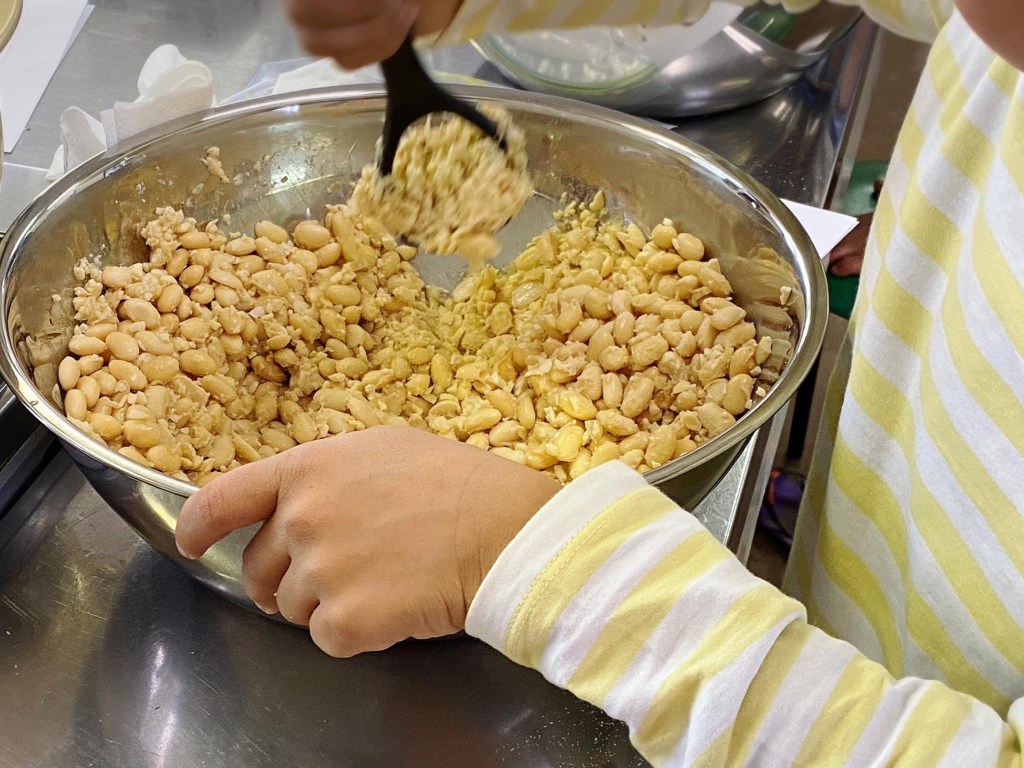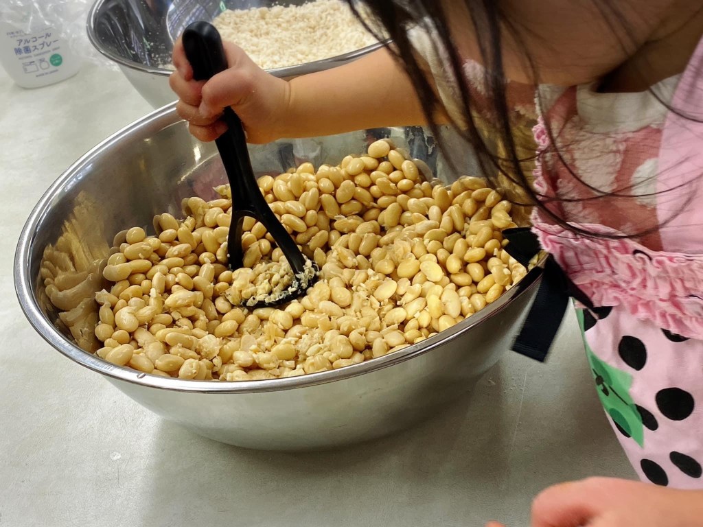 小さな手で大事そうに麹をばらし、大豆を潰して、混ぜて詰める。・・・と、言葉にすると、とても簡単ですが、その中にポイントがいくつもあります。子どもたちは上手にポイントをクリアしていました。