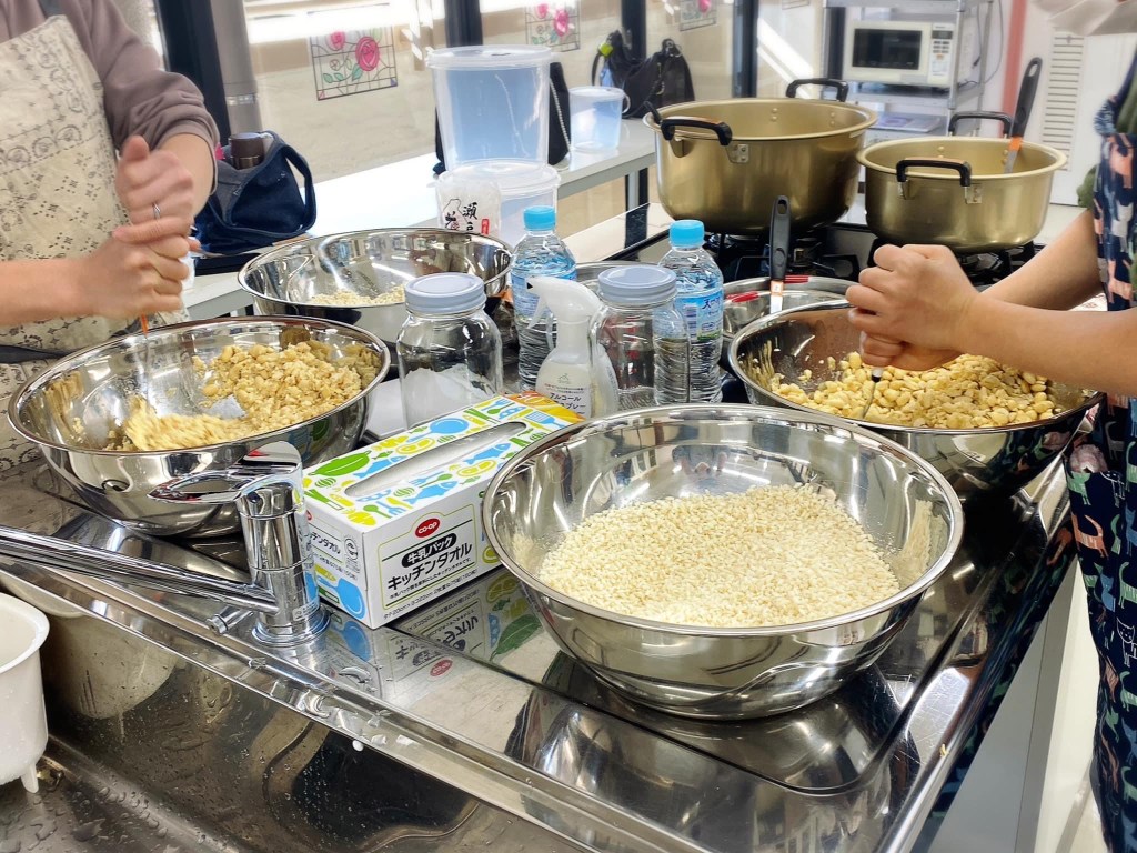 第二回目では、親子参加やご夫婦参加もあり、終始、和気藹々と和やかな雰囲気でした。この回では小学生が3名も参加してくださったので、最初の座学のボリュームは少なめにし、内容もくだいて話をしました。味噌をつくったことのある方も、初めて味噌づくりをした方も、初対面でも皆、味噌づくりを楽しんでいただけたようでした。