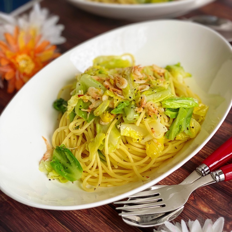春キャベツと海の宝石桜エビで身体にうれしい春色パスタ 短時間で調理のできるペペロンチーノは栄養損失が少ない調理 …